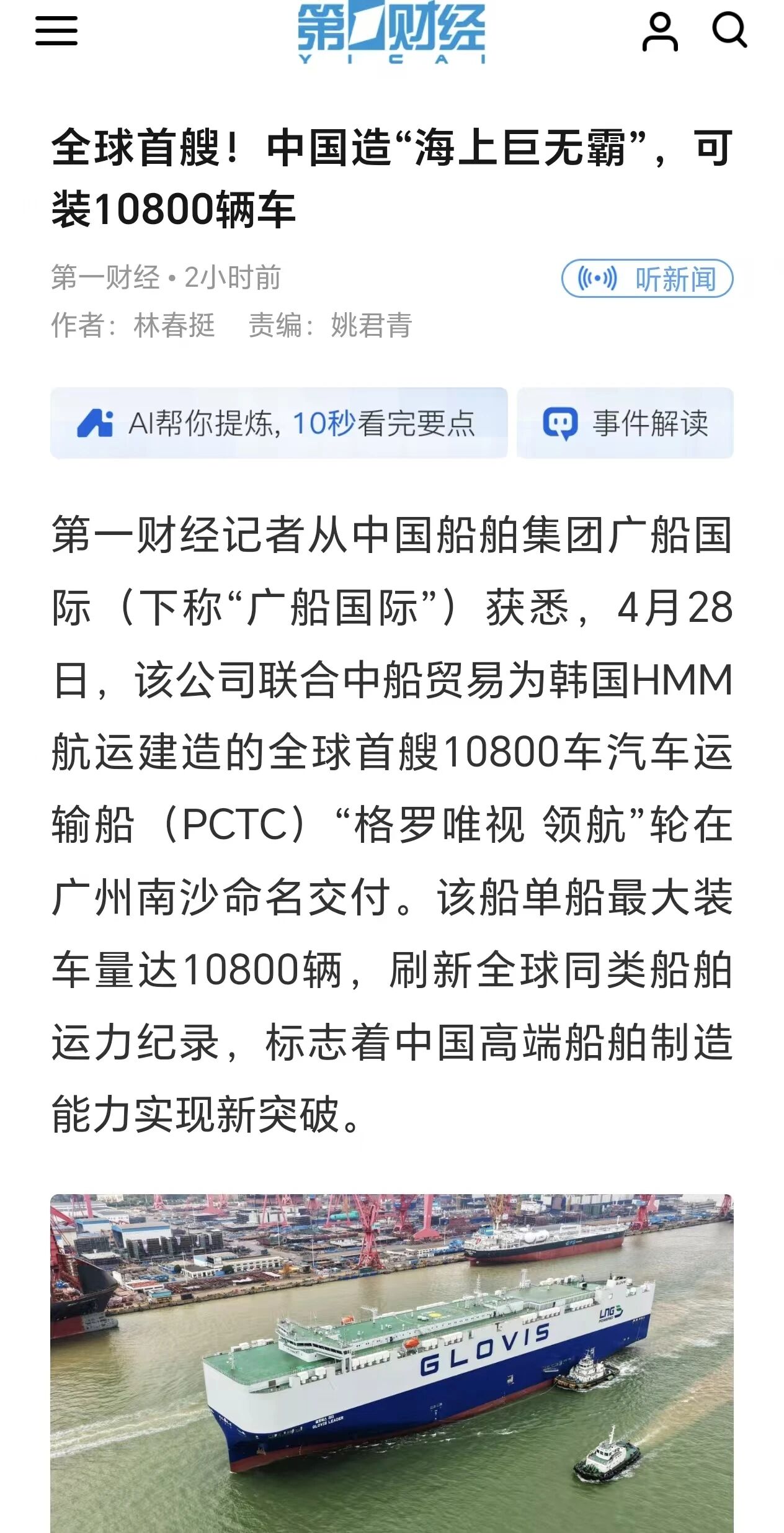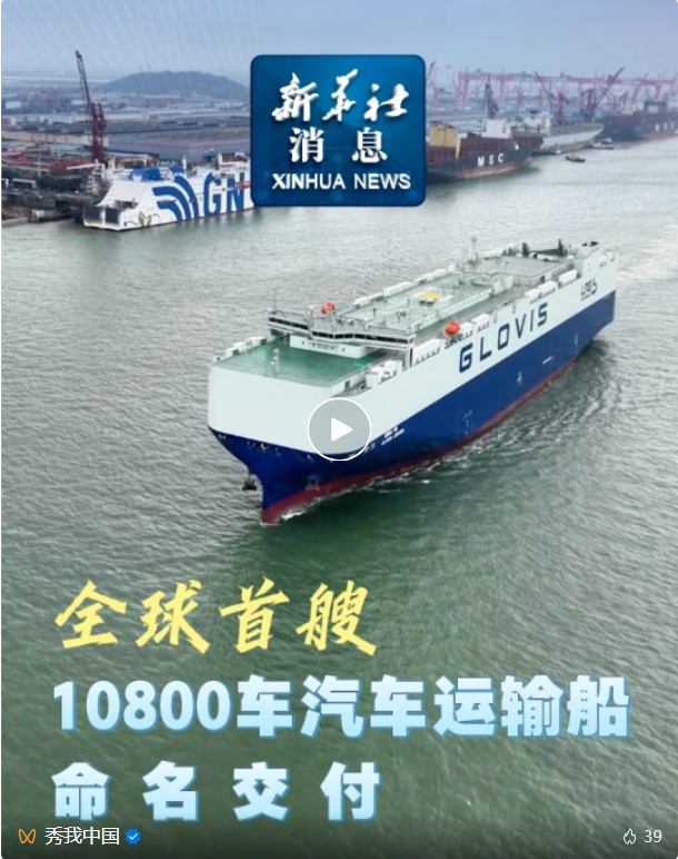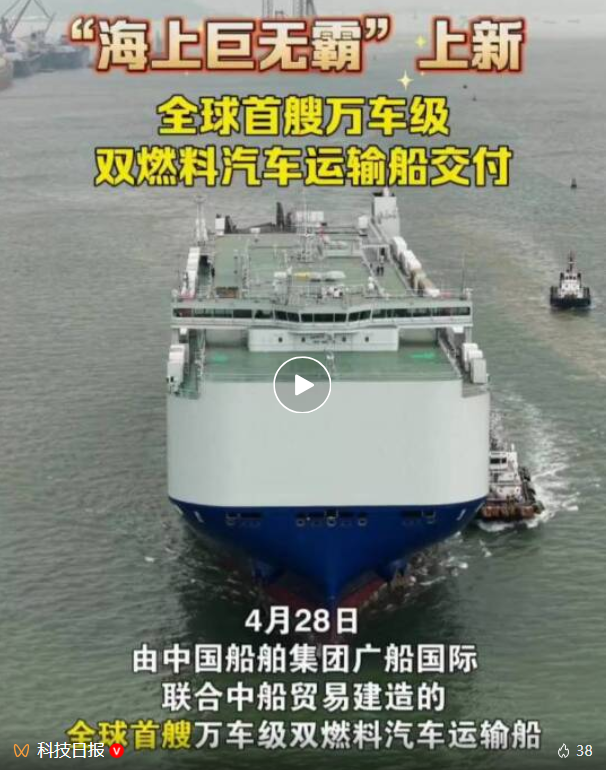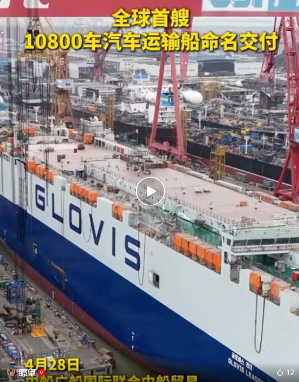 今天(4月28日),央视《新闻联播》对全球首艘10800车汽车运输船交付进行了关注报道。该船由中国船舶集团有限公司旗下六〇四院研发设计、广船国际联合中船贸易建造、七〇四所提供关键配套。